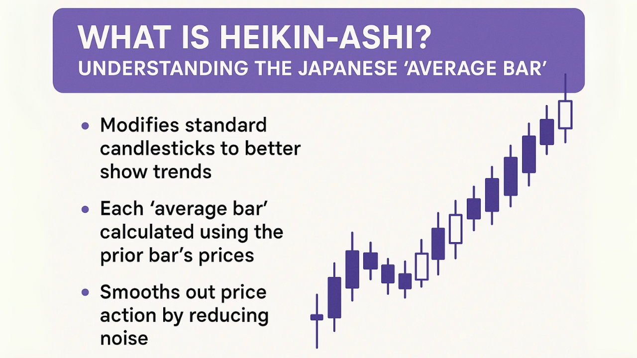 Heikin-Ashi is a Japanese charting technique that averages price data to create smoother, trend-revealing charts by filtering out market noise